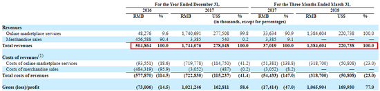 新的营收模式推动了平台收入的快速增长。2016年拼多多年收入为5.05亿元人民币,而到了2017年,收入达到17.44亿元人民币,2018年Q1已经实现13.85亿元人民币营收,同比增长37倍。
