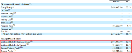 招股书显示,黄峥在拼多多占股50.7%,腾讯18.5%,高榕资本10.1%,红杉资本7.4%。招股书同时披露了拼多多与腾讯的业务合作。2018年2月,拼多多与腾讯达成战略合作框架协议,有效期为五年。